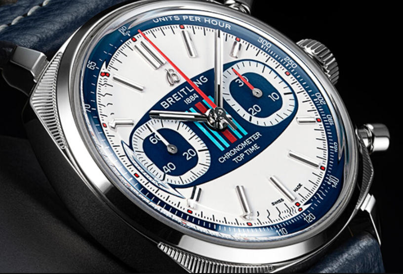 This most recent cushion-shaped Top Time chronos doesn’t feature a car-specific model, per se, but rather a nod to the Martini Racing, which many of you might associate with Porsche. The motorsport brand’s signature colors are dark blue, light blue, and red, which have been given to one of the three new cheap replica Breitling Top Time watches. Featuring a white dial background, the center patch connecting the two chronograph registers features this dark blue with the vertical stripe pattern in the center, behind the handset. This color also shows up on the minute track around the dial. It’s paired with a matching blue leather strap.