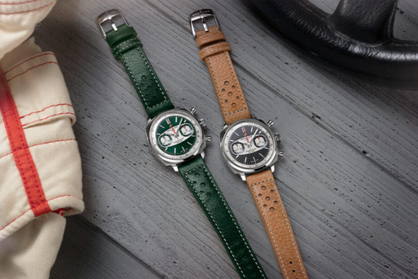 There are two other rally-inspired variants as well, but they’re not branded with Martini Racing: a green dial with white patch and minute track, and a black dial with silver patch and minute track. For the green, there’s a matching green leather strap, while the black gets a tan leather strap.