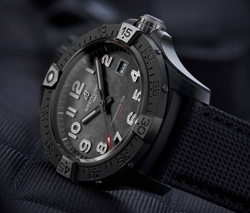 The dial fitted to the new Breitling Avenger Automatic 42 Night Mission represents a notable departure from those of its stainless steel siblings, and it features a forged carbon surface with bold Arabic numerals taking the place of the baton-shaped hour markers on the steel models. The updated style of indexes provides the Night Mission version with an inherently more utilitarian appearance, and small bright red accents appear throughout its dial and on the tip of its seconds hand. Just like the stainless steel time-and-date Avenger models, the Night Mission version is powered by the Breitling Caliber 17 automatic movement, which is a COSC-certified chronometer based upon the design of the venerable ETA 2824-2 that runs at a frequency of 28,800vph (4 Hz) with a power reserve of approximately 38 hours. Additionally, completing the new cheap replica Breitling Avenger Automatic 42 Night Mission watches is the dark anthracite-colored leather and textile strap that is fitted with a deployant-style folding clasp made from titanium.
