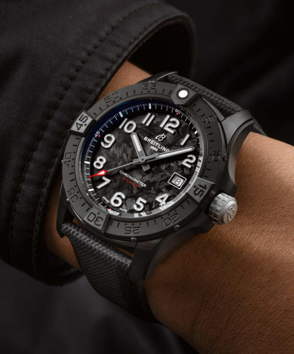 Due to their black ceramic cases, the Swiss reproduction Breitling Avenger Night Mission watches naturally cost more than their stainless steel equivalents, and the time-and-date Breitling Avenger Automatic 42 Night Mission is the least expensive at $6,300 USD, while the GMT-equipped Night Mission model costs $6,950 USD due to its larger size and more complex movement. Meanwhile, the Breitling Avenger B01 Chronograph 42 Night Mission is priced at $9,550 USD when fitted with a turquoise dial or $9,750 USD when buyers opt for the forged carbon dial version, and the 46mm Avenger Night Mission Chronograph is the most expensive among the series with an official retail price of $9,950 USD. Despite its generous durability, the Avenger collection has always been one of Breitling’s more value-driven offerings, and while the new Night Mission models are tangibly more expensive than their stainless steel counterparts, they still represent a solid value proposition within Breitling’s modern lineup, as even the top-of-the-line version costs negligibly more than a stainless steel Navitimer.