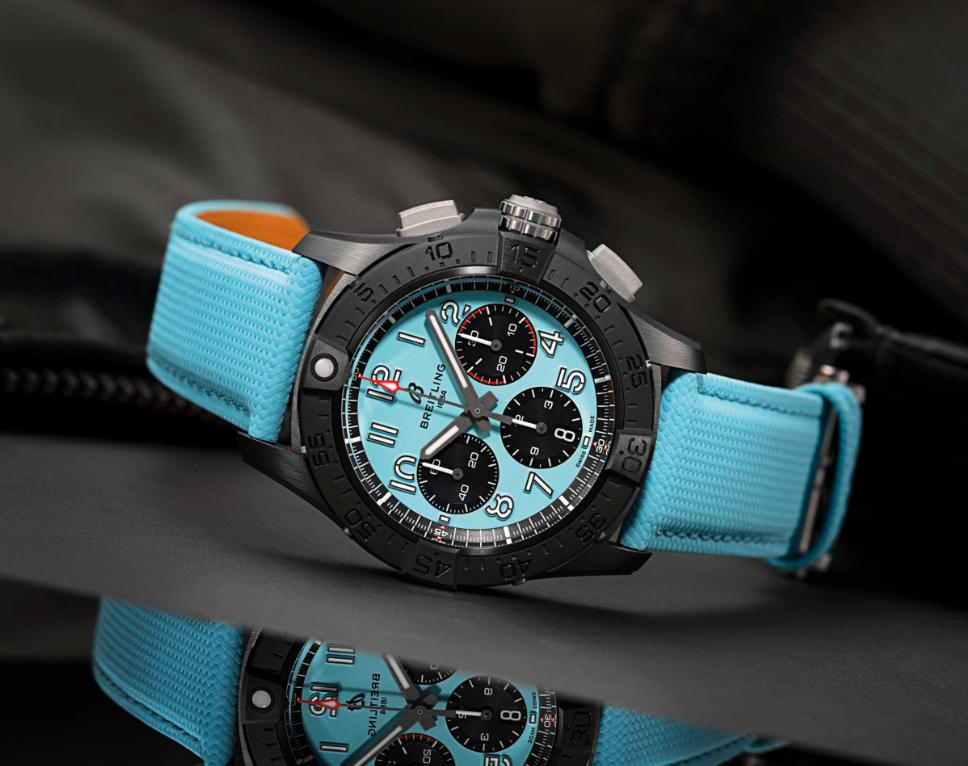 The smaller of the two chronograph-equipped Night Mission models is the perfect duplicate Breitling Avenger B01 Chronograph 42 Night Mission watches, and it measures 42mm in diameter by 15.15mm thick, with 22mm lugs and a lug-to-lug profile of 51.21mm. Additionally, the 42mm version of the Avenger Night Mission Chronograph is available in two different configurations, which include the turquoise dial (ref. SB0146101L1X1) and the forged carbon dial (ref. SB0146101B1X1). While the turquoise version has contrasting black registers and a black-finished minute track, the forged carbon version has black registers with khaki-colored luminous material filling its Arabic numeral hour markers. Similarly, both Avenger B01 Chronograph 42 Night Mission models feature leather and fabric straps with titanium deployant clasps that complement their respective colorways, and while the turquoise version receives a matching turquoise-colored strap, the carbon dial model has a khaki-colored strap that leans into the hue of its hour markers