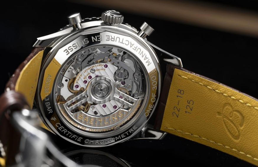 The open caseback reveals the COSC certified Breitling Manufacture Caliber 01, a movement respected throughout the industry for its precision, durability, and more than seventy hours of power reserve, supported by a five year warranty and engraved with “ONE OF 300” and “LIMITED EDITION,” reinforcing the exclusivity of this release while allowing wearers to appreciate the mechanical artistry behind every tick, every reset, and every carefully engineered component.